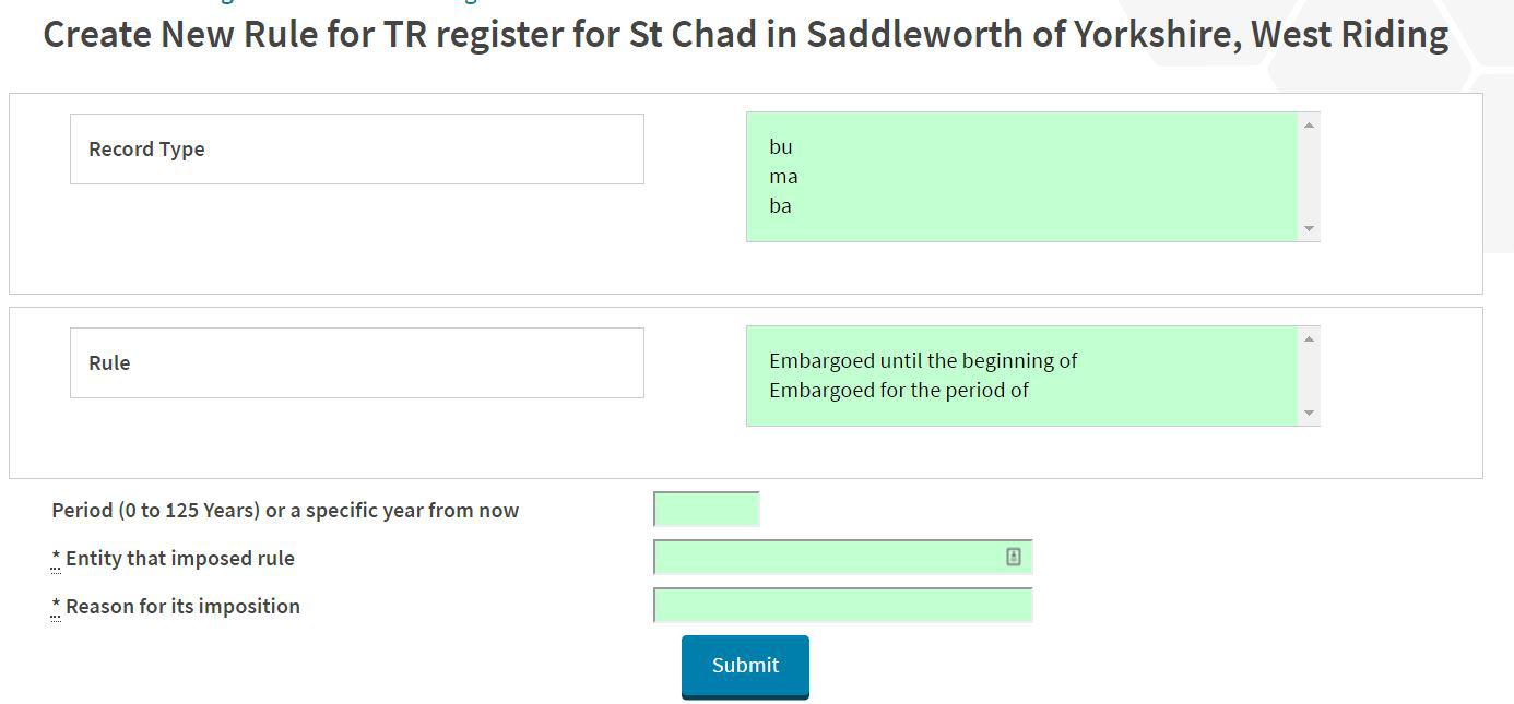 Say we have images for a burial register up to 2018, but the Record Office asks that they are not shown in search results until 50 years after the event. As coordinator, you can set up (establish) the 50-year rule for the whole register, the transcriber can transcribe and upload the complete register, but only those events that are at least 50 years old will be found in a search. Each year, the system will automatically release any records that are no longer subject to the embargo rule.